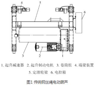 該設(shè)備與傳統(tǒng)鋼絲繩電動(dòng)葫蘆相比較,其主要構(gòu)成部件較為相似,由起升制動(dòng)電機(jī)、起升減速器、卷筒組、定滑輪梁、端梁裝置和電控箱等組成。