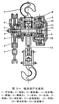 圖3-4為齒輪式手拉鏈條葫蘆。當(dāng)提升重物時,手拉鏈1使鏈輪2按順時針方向轉(zhuǎn)動。鏈輪2沿著圓盤5套筒上的螺紋向里一動,而將棘輪圈3和摩擦片6都壓緊在鏈輪軸4上(鏈輪軸4與圓盤5牢固形成一體),棘輪圈3只能順時針方向轉(zhuǎn)動,棘爪在棘輪圈3上跳動發(fā)出嗒嗒之聲。鏈輪軸4右端的齒輪12帶動齒輪9(或稱行星齒輪)與固定齒圈8相嚙合,使齒輪9沿鏈輪軸4為中心順時針方向移動。同時帶動驅(qū)動機構(gòu)13和起重鏈輪11轉(zhuǎn)動,使起重鏈子14上升。當(dāng)不拉手拉鏈之后,重物是靠自重產(chǎn)生的自鎖現(xiàn)象和棘爪組織棘輪圈3逆時針方向轉(zhuǎn)動而停止在空中。反之,當(dāng)松下重物時,手拉鏈1使鏈輪2和圓盤5分離。則鏈輪軸4右端的齒輪12帶動齒輪9與固定齒圈8相嚙合,使齒輪9沿鏈輪軸4為中心逆時針方向轉(zhuǎn)動,同時帶動驅(qū)動機構(gòu)13和起重鏈輪11轉(zhuǎn)動,使起重鏈子14下降。當(dāng)不拉手拉鏈之后,因鏈輪2停止轉(zhuǎn)動時,起重鏈輪11受重物自重還要繼續(xù)沿逆時針方向轉(zhuǎn)動,行星齒輪傳動機構(gòu)同樣沿逆時針方向繼續(xù)轉(zhuǎn)動,使圓盤5、摩擦片6及棘輪圈3相互之間相互壓緊而產(chǎn)生摩擦力,棘輪圈3受棘爪阻止不能向逆時針方向轉(zhuǎn)動,于是摩擦力作用在螺紋上產(chǎn)生自鎖,使重物停止在空中。
