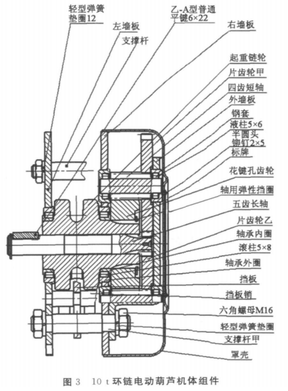 葫蘆機(jī)體的組件圖樣如圖3所示,其中齒輪傳動(dòng)采用2組對(duì)稱排列的二級(jí)直齒圓柱齒輪傳動(dòng)。I級(jí)和II級(jí)齒輪傳動(dòng)具有相同的實(shí)際中心距。