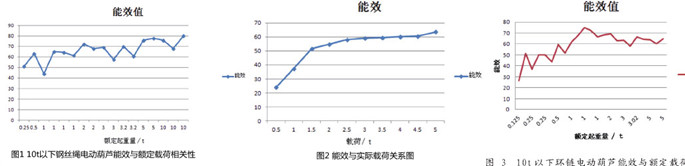 在對(duì)不同規(guī)格,不同型號(hào)的環(huán)鏈電動(dòng)葫蘆的能效值進(jìn)行對(duì)比的同時(shí),還收集了同1臺(tái)葫蘆在從輕載到額載工況下,能效隨試驗(yàn)載荷變化而變化的試驗(yàn)數(shù)據(jù)。經(jīng)過對(duì)數(shù)據(jù)的分析,圖2列舉了一臺(tái)5t的雙速環(huán)鏈電動(dòng)葫蘆能效隨載荷變化的變化曲線,此曲線具有廣泛代表性。根據(jù)曲線趨勢(shì),可得出以下結(jié)論,鋼絲繩電動(dòng)葫蘆在吊載不足30%額定起重量的載荷時(shí),其能效值很低,大量能量均被浪費(fèi),當(dāng)?shù)踺d重物超過30%額定起重量的載荷時(shí),電動(dòng)葫蘆的能效值會(huì)有顯著提升,并逐漸趨于高能效值,直至吊載重物超過50%額定起重量,能效值變化非常微小,趨于穩(wěn)定。