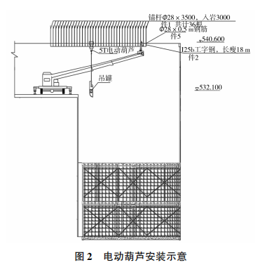 在抽水蓄能電站地下廠房土建及機(jī)電設(shè)備安裝施工過程中,因施工場地空間受限,導(dǎo)致材料垂直運(yùn)輸通道單一影響現(xiàn)場施工進(jìn)度。為解決此類問題,利用電動葫蘆具有體積小、自重輕、操作簡單、使用方便等特點,采用在副廠房頂拱巖體位置安裝電動葫蘆、副廠房各樓層預(yù)留吊物孔的方式,形成副廠房臨時垂直運(yùn)輸通道,滿足土建施工期模板、腳手架。機(jī)電設(shè)備安裝期空壓機(jī)氣罐、電氣盤柜等材料設(shè)備的轉(zhuǎn)運(yùn),有效利用現(xiàn)場施工空間。從而達(dá)到提升施工效率、降低現(xiàn)場施工強(qiáng)度及節(jié)約施工成本的目的。