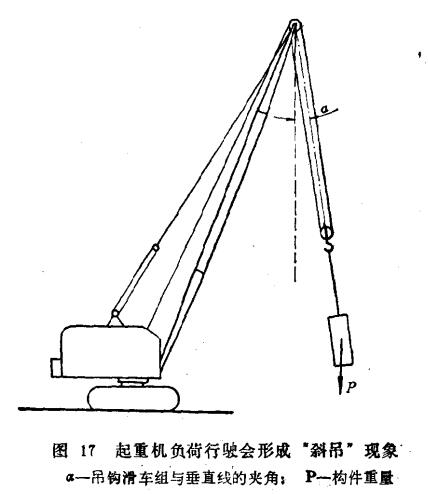 因為起重機負衙行駛時,由于道路不平或慣性原因,構件總難免要發(fā)生擺動而使起重機吊鉤滑車組離開垂直線位置,形成“斜吊”,如圖17所示。如果起重機吊著重量為P的構件已是滿負荷。則當梅件擺動后,實際就是格負荷了。構件擺動的夾角a如過大,傾覆力矩增大,起重機就可能翻車。因此,起重機滿負荷時要盡量避免行駛。如需作短距離行駛,只熊將構件吊離地面20—30厘米,且要慢行,還必須拉好溜繩,控制構件擺動。更多問題解答關注凌鷹電動葫蘆專業(yè)廠家。